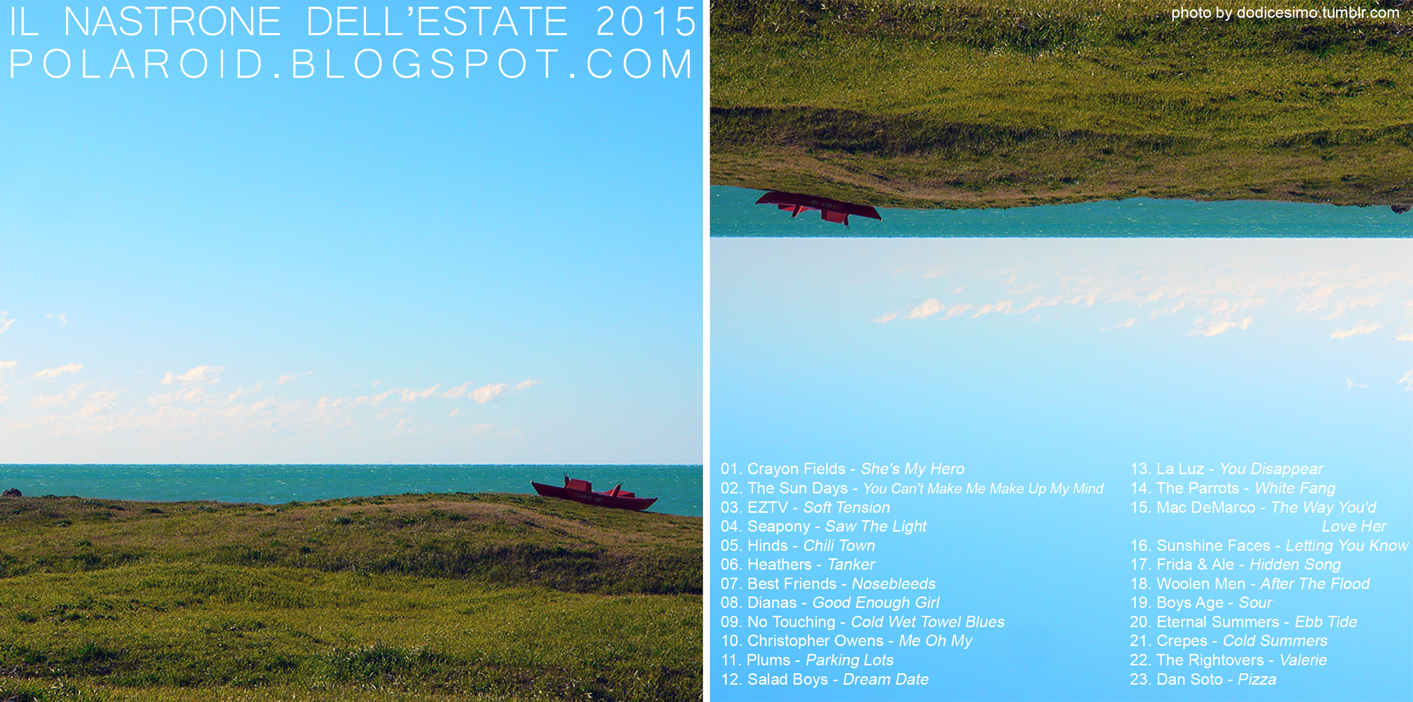A metà estate, a metà settimana, a metà strada tra la casa e il mare, avevo bisogno di un nastrone per il viaggio, e non avevo ancora deciso come avevo voglia di sentirmi. Così nella scaletta sono finiti un po' di indiepop e un po' di garage rock, un po' di chitarre scintillanti e un po' di riverberi malinconici, un po' di bagni di mezzanotte e un po' di pigri pomeriggi azzurri. Più Australia che Svezia, più lo-fi che cassa dritta, più brindisi che browser. Spero che vi piaccia, è solo un nastrone per augurarvi Buone Vacanze!